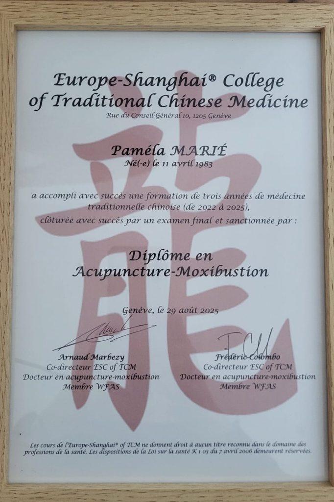 Cette première formation a naturellement éveillé en moi le désir d’explorer plus profondément la médecine traditionnelle chinoise. J’ai ainsi poursuivi mon parcours avec une formation avec une formation complète en médecine chinoise et acupuncture à Shanghai College of Traditional Chinese Medicine à Genève.